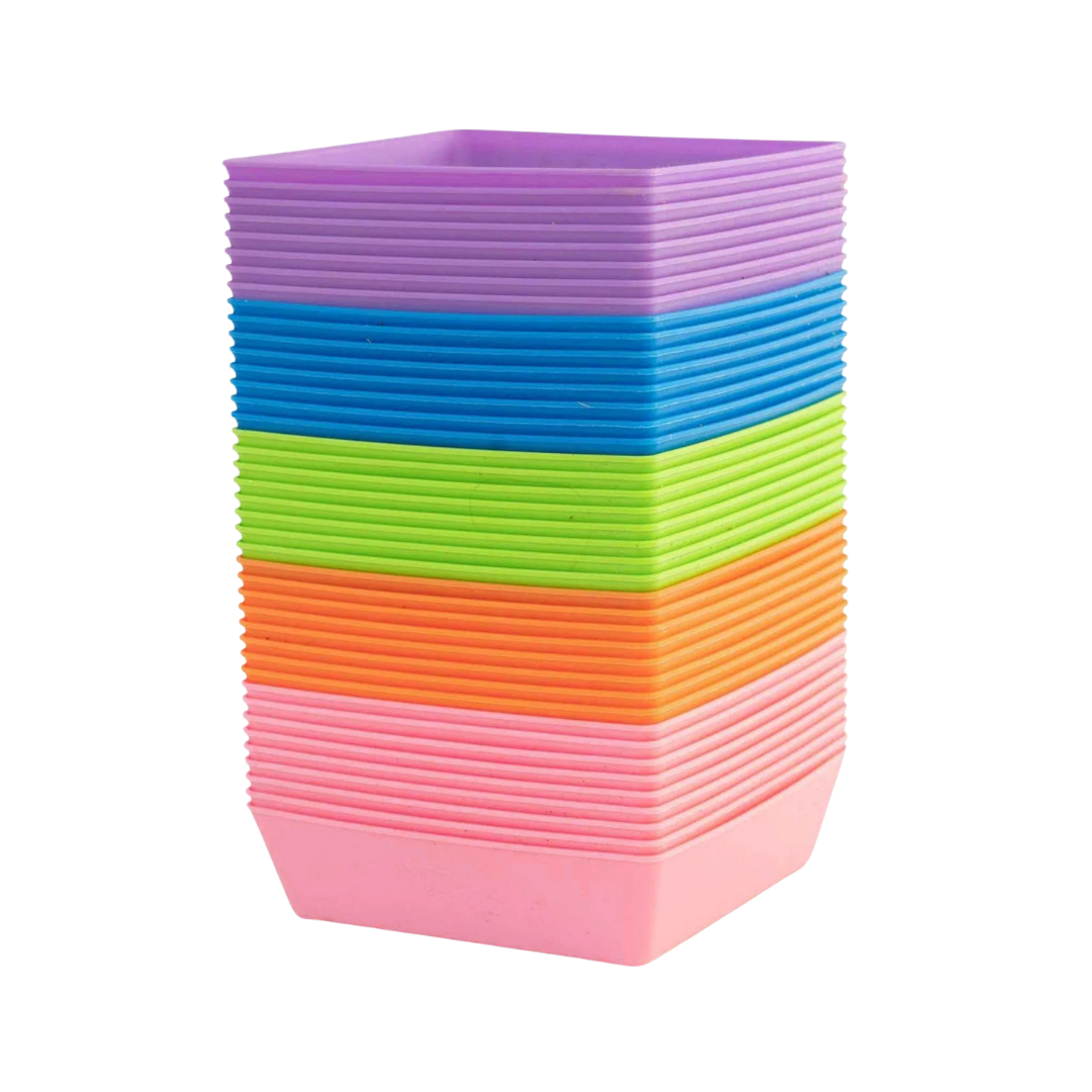 Microgreen growing tray, dimensions 5 x 5 x 1.3 in (12.7 x 12.7 x 3.3 cm). Available with drainage or waterproof. Made of rigid and durable plastic, compatible with modular tray systems.